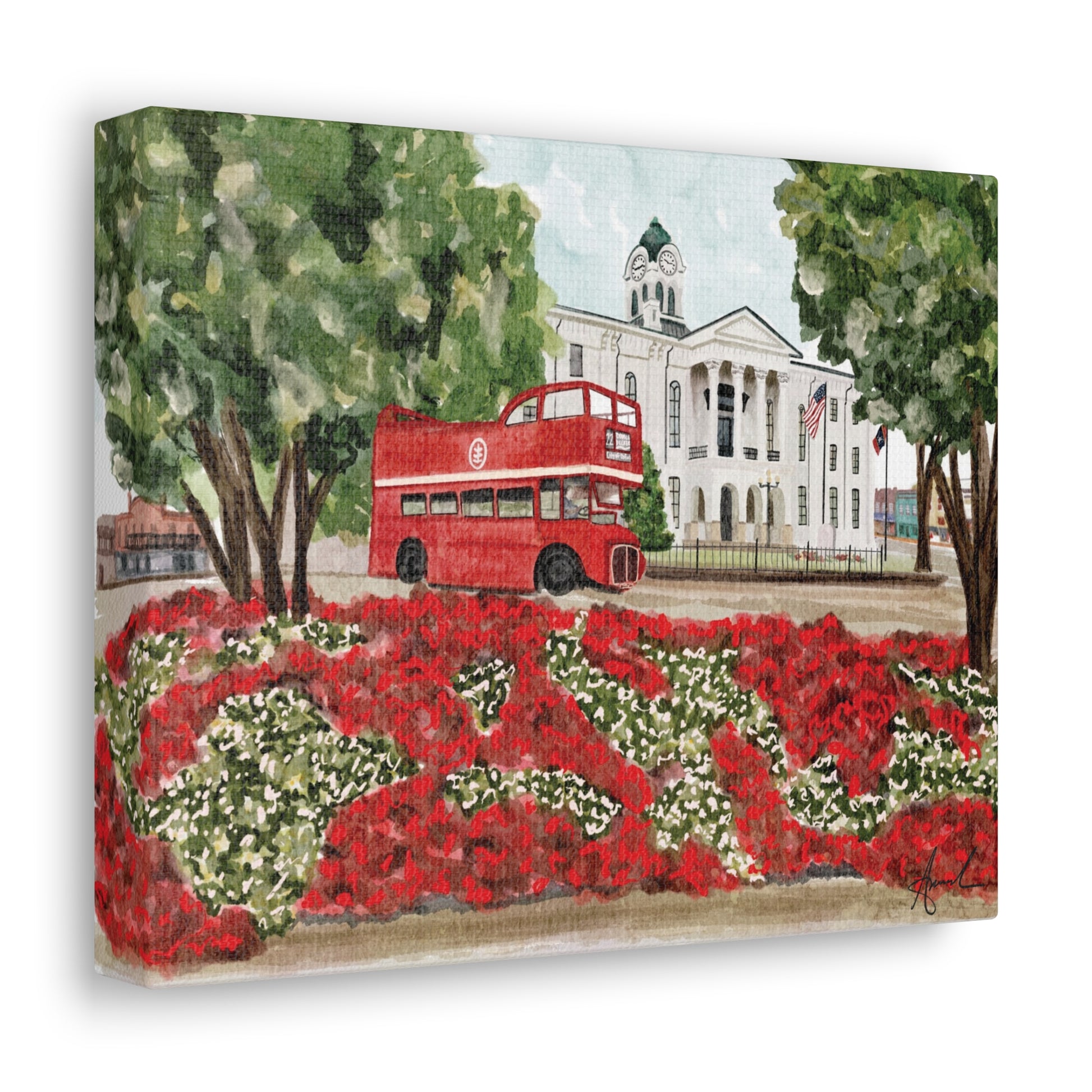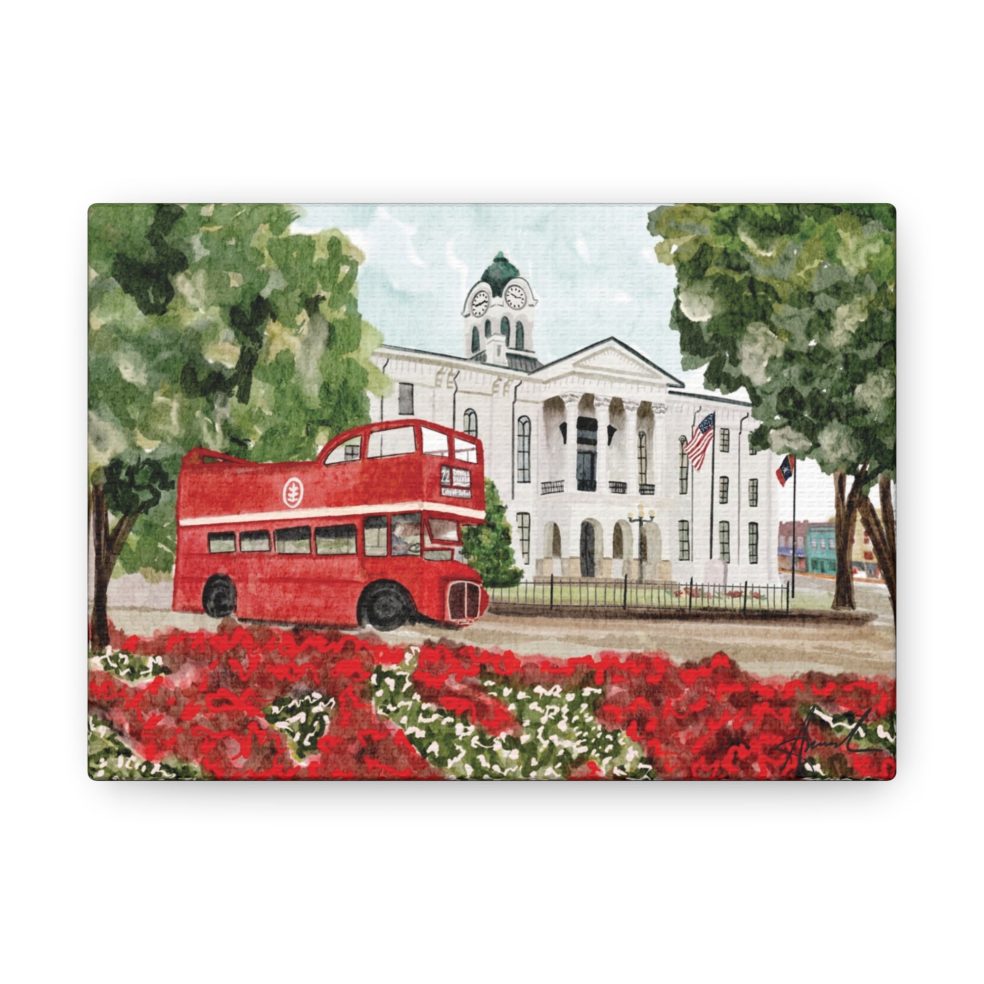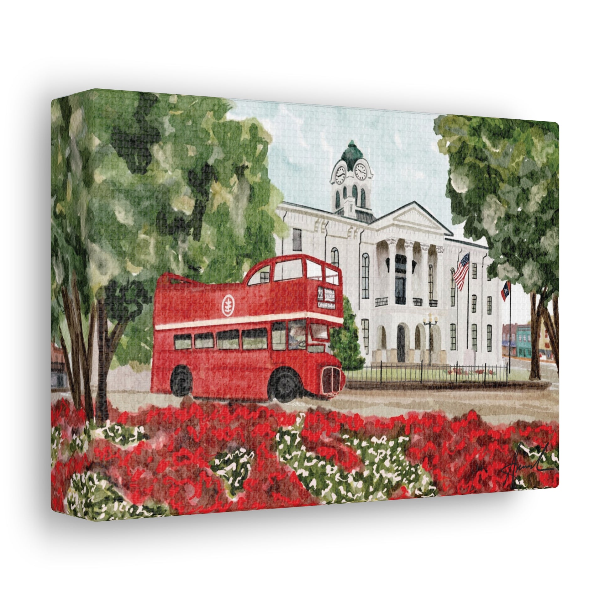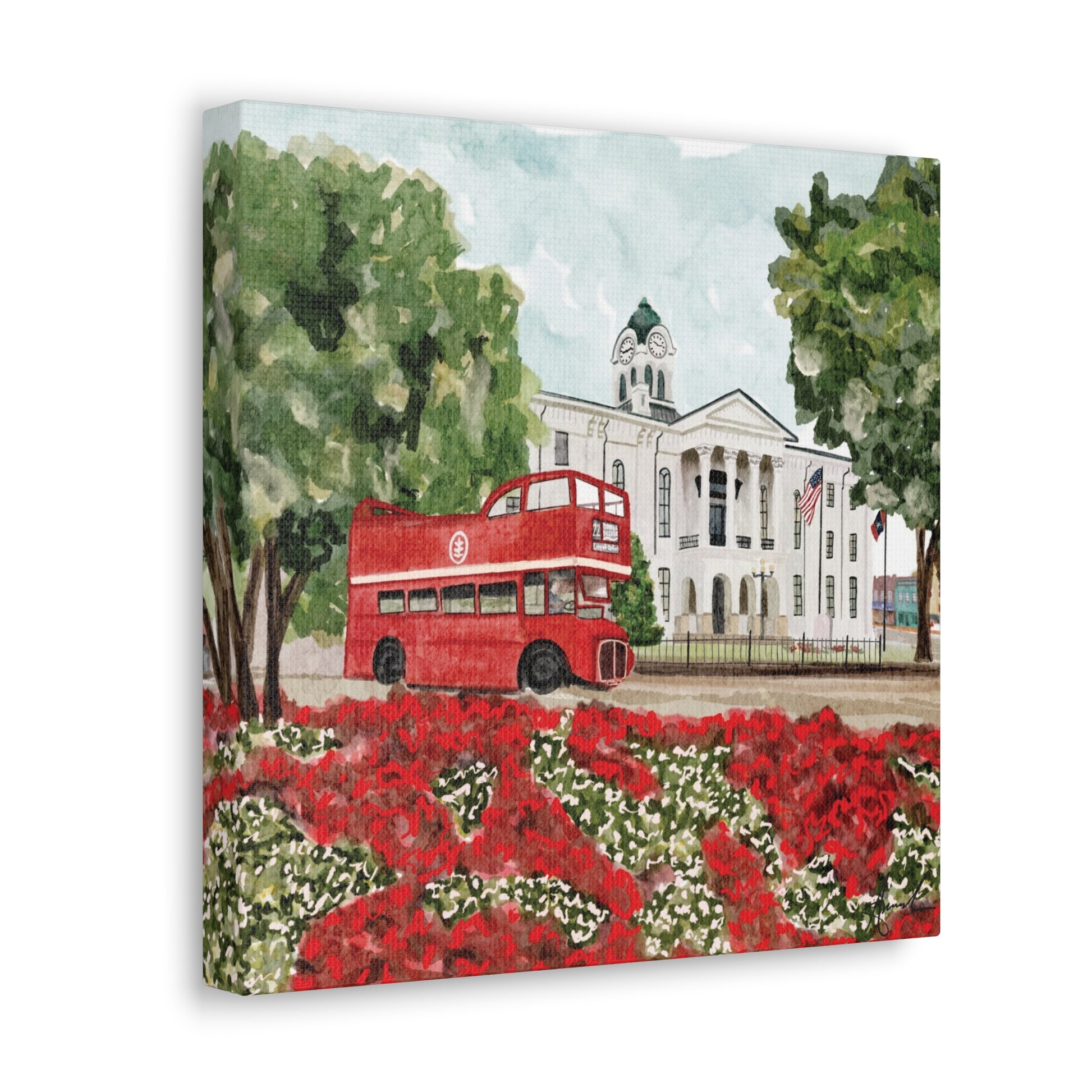 Courthouse Square Double Decker Bus Oxford MS Watercolor Art Canvas