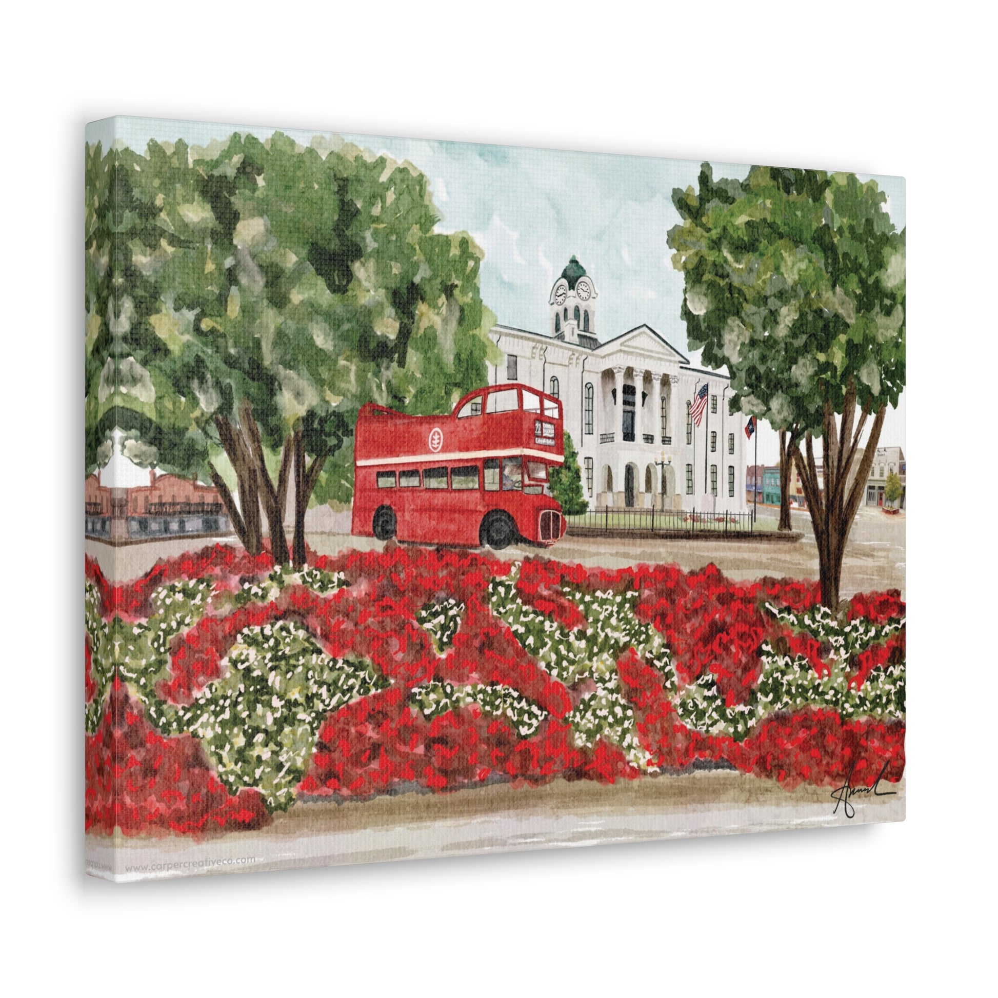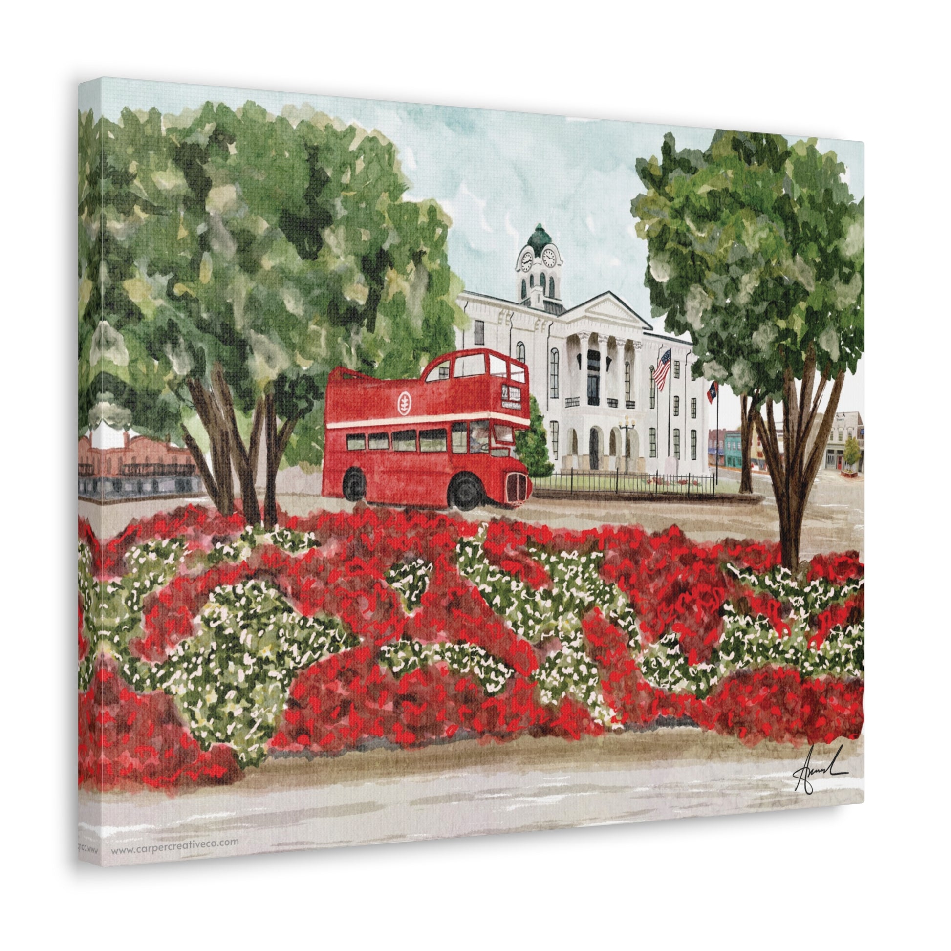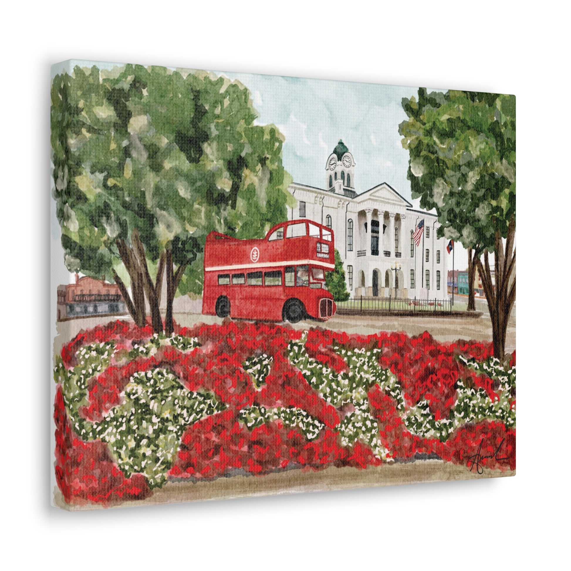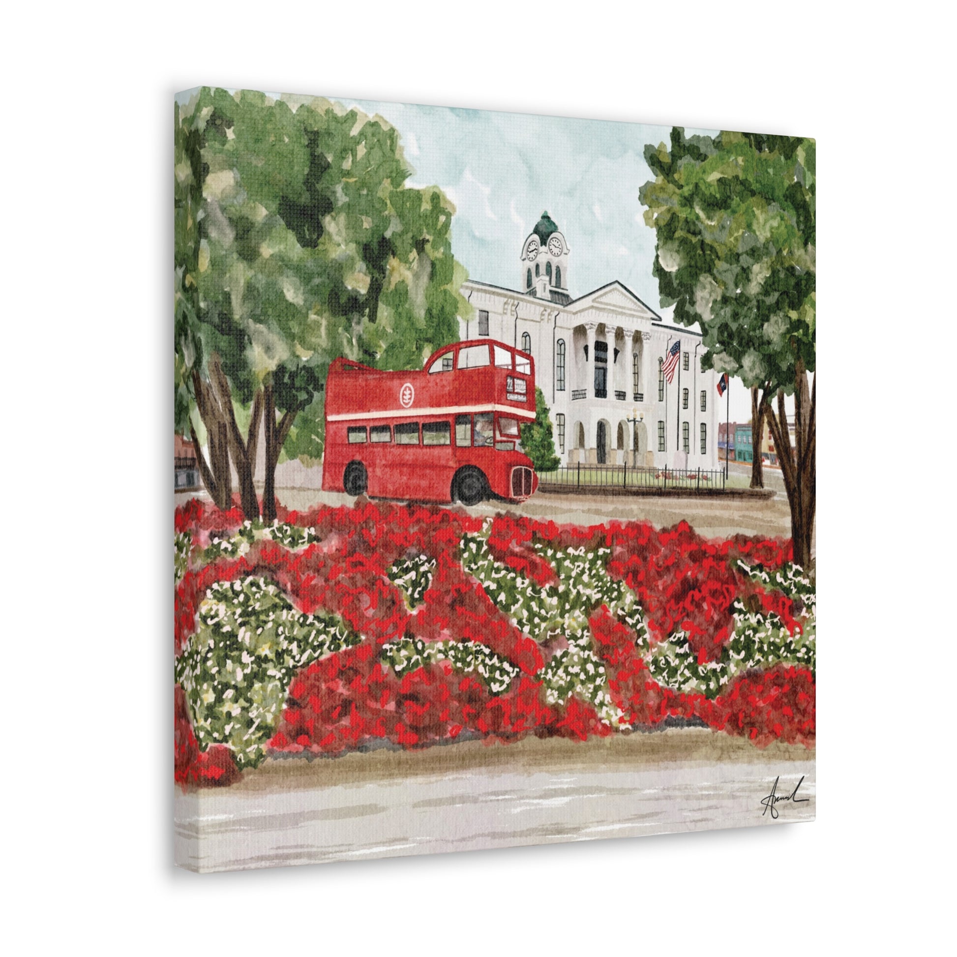 Courthouse Square Double Decker Bus Oxford MS Watercolor Art Canvas