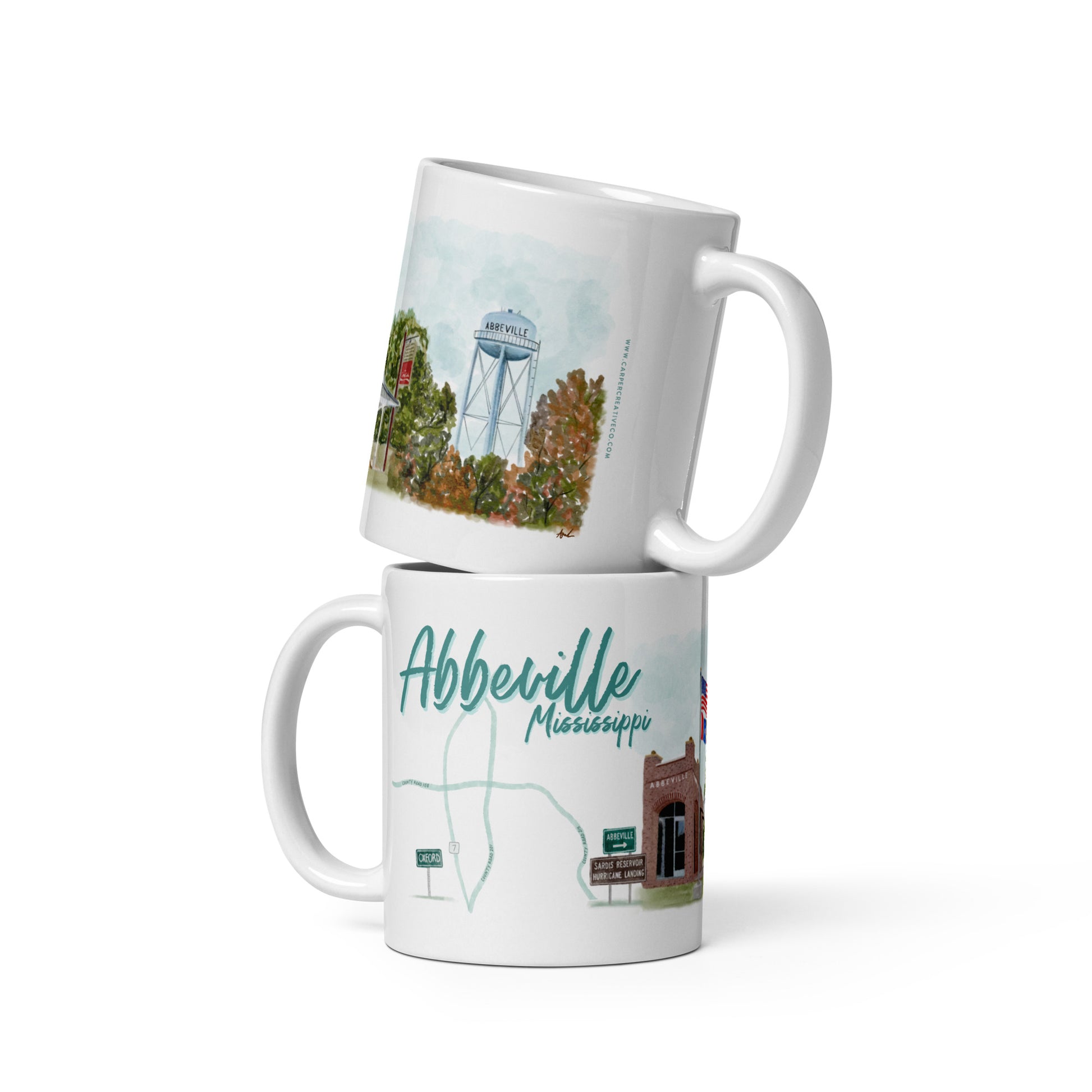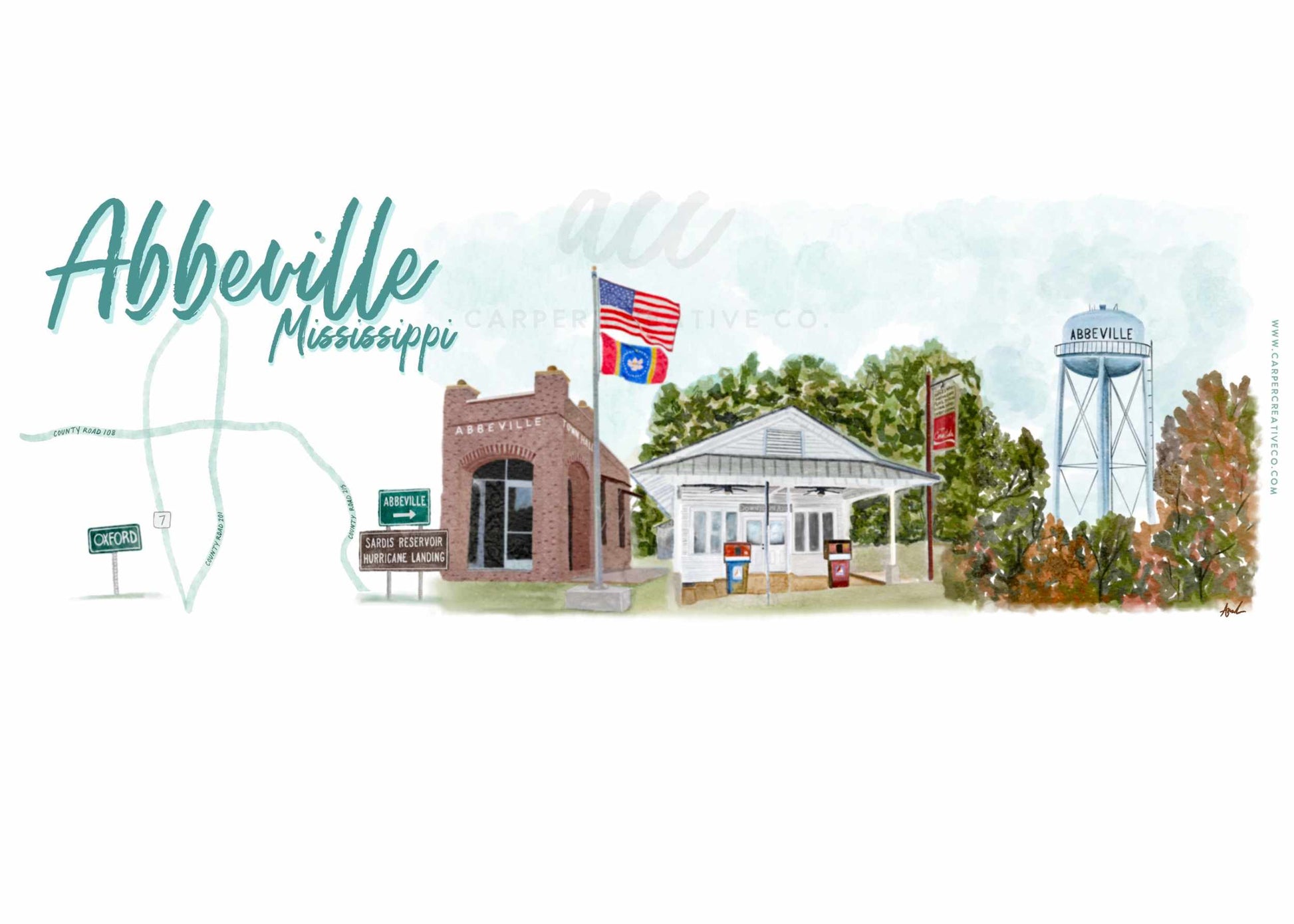 Located about 15 minutes from Oxford, Abbeville has its unique charm. This design includes the Abbeville water tower, City Hall, and Ruth and Jimmies old sporting goods store.