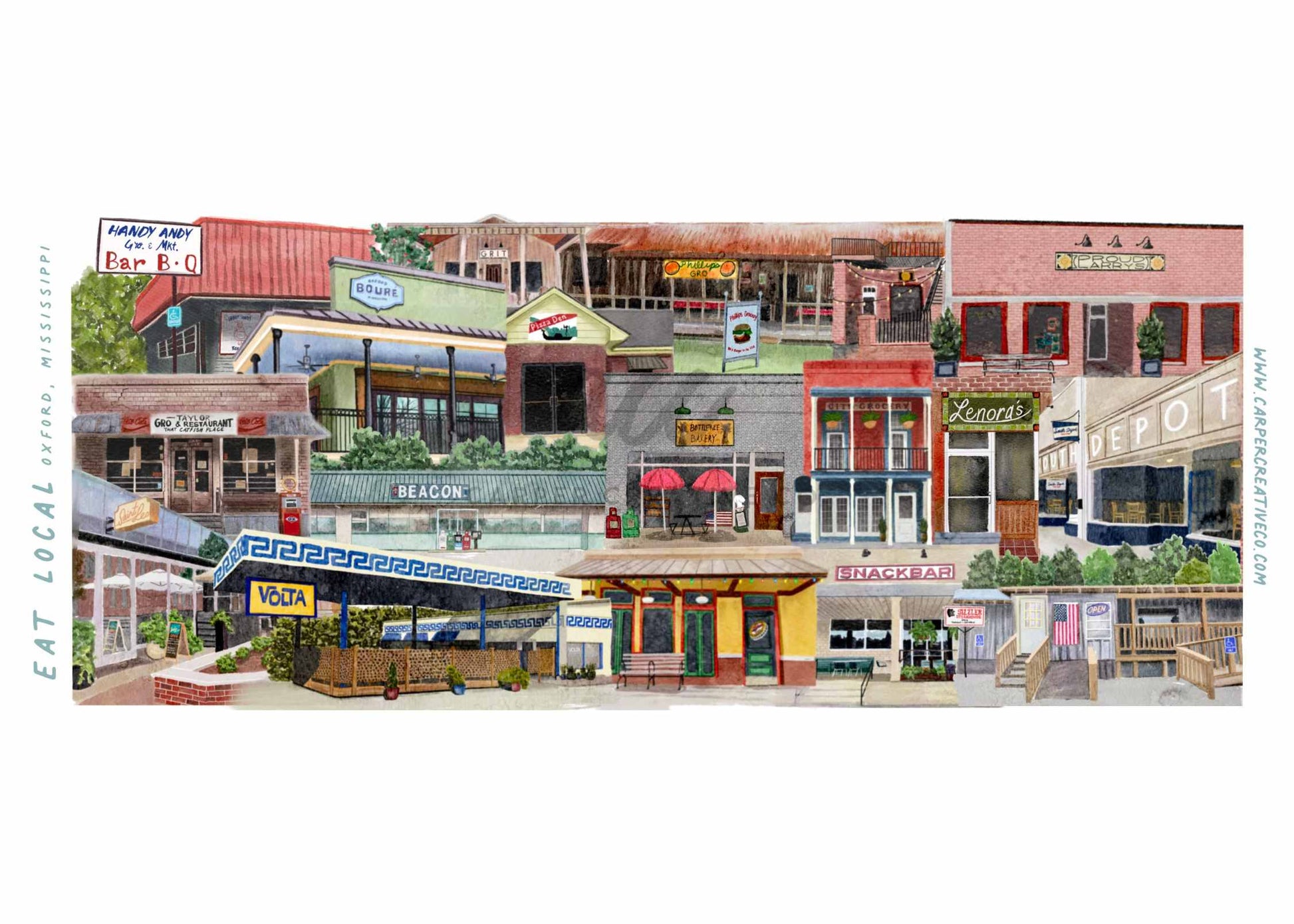 This collage includes some of the favorite local restaurants including Ajax, Beacon, Phillip's Grocery, Taylor Grocery, Volta, Bottletree Bakery, Grit, Saint Leo, Handy Andy, and more!